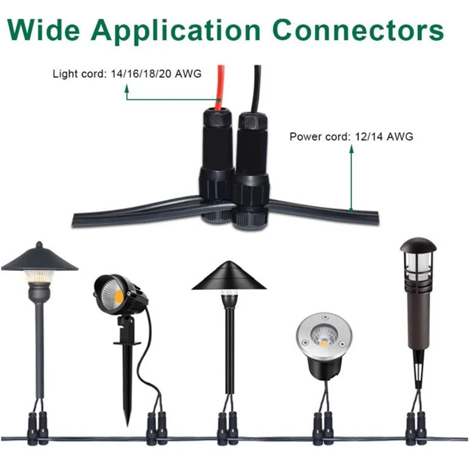 Szczelne złącze uniwersalne do wpinania w dowolnym miejscu na przewodzie 12AWG, 14AWG, 16AWG, 18AWG. Wymaga zdejmowania izolacji z przewodów podłączanej lampy na długości 5 mm. Szczelność IP44.