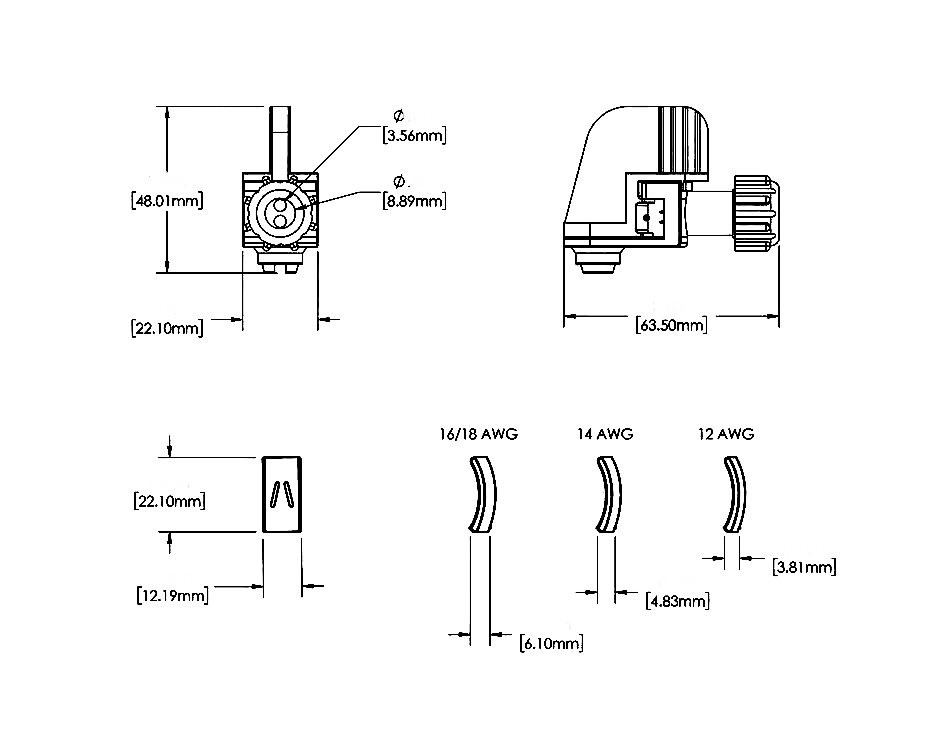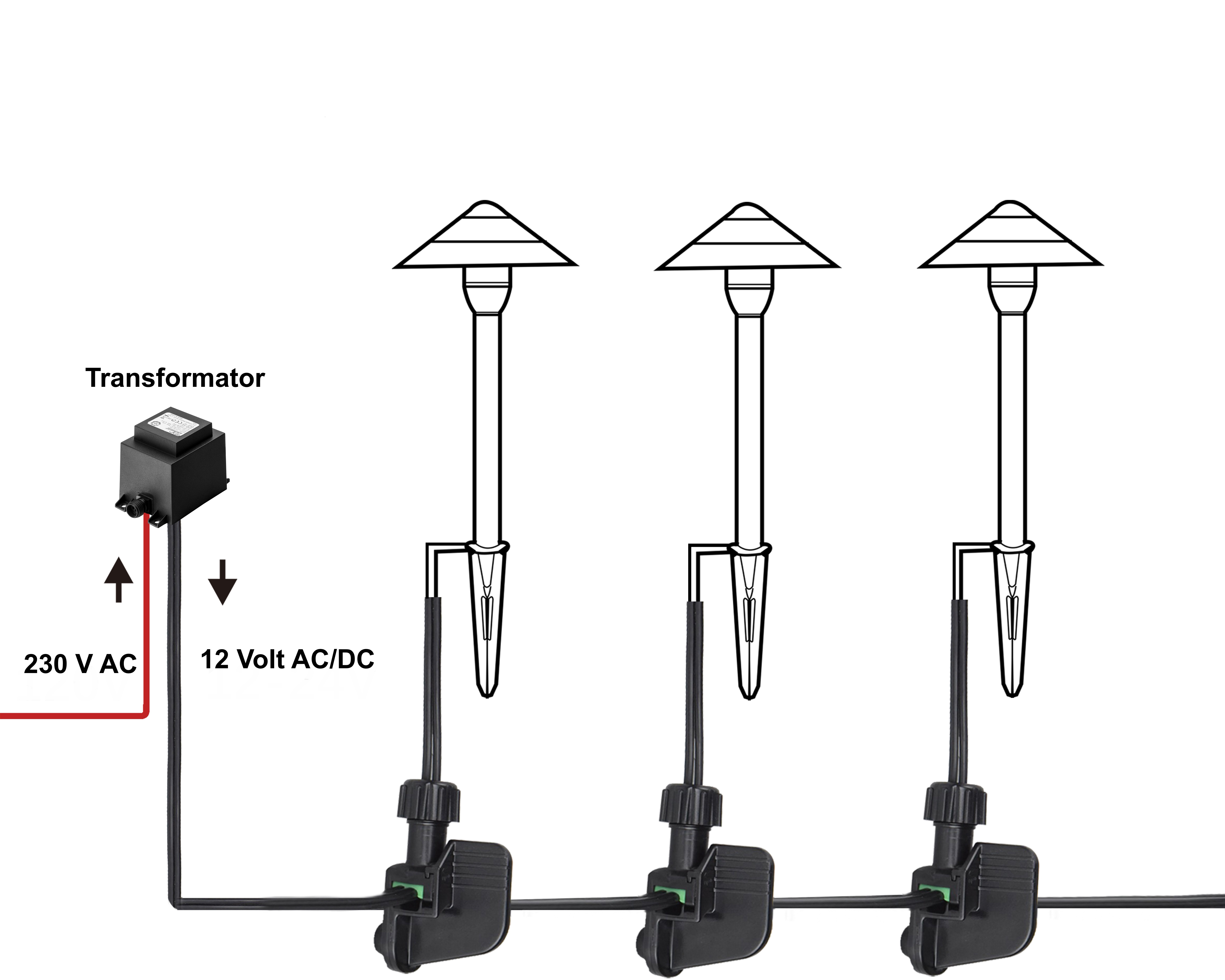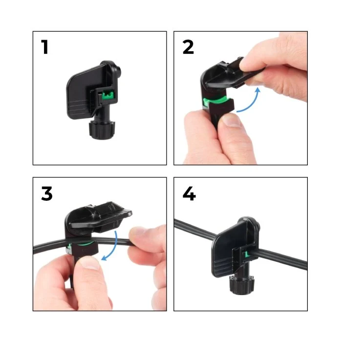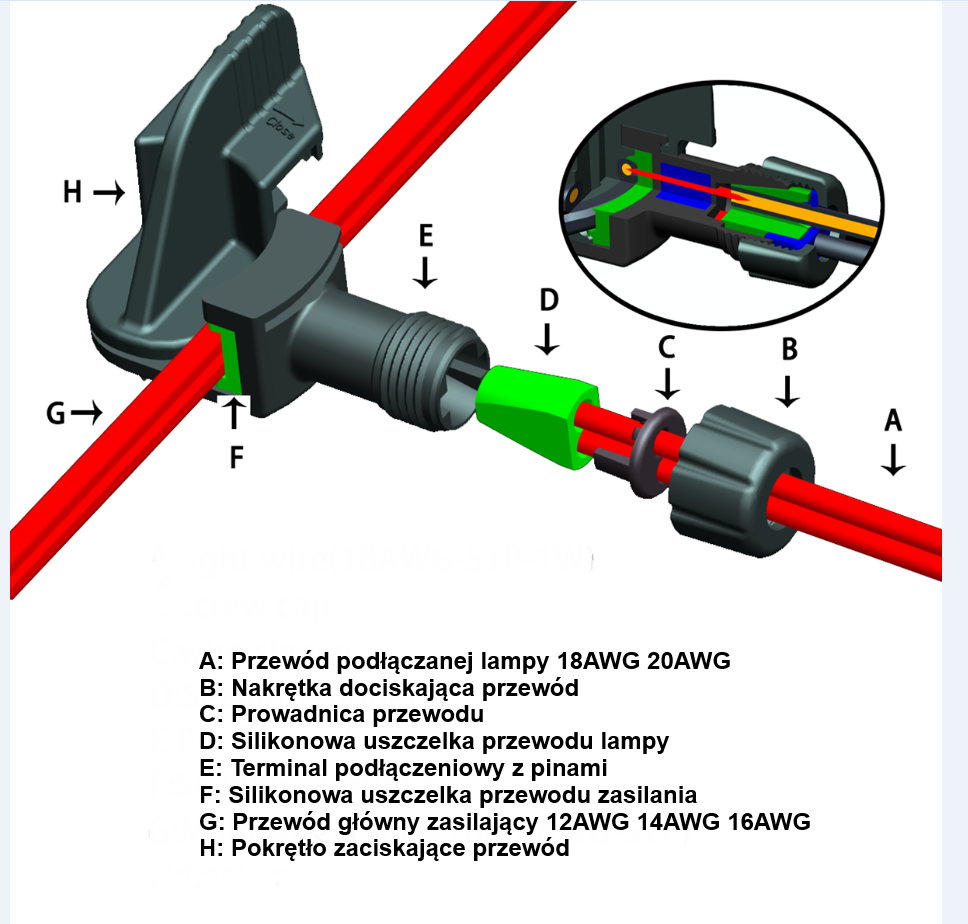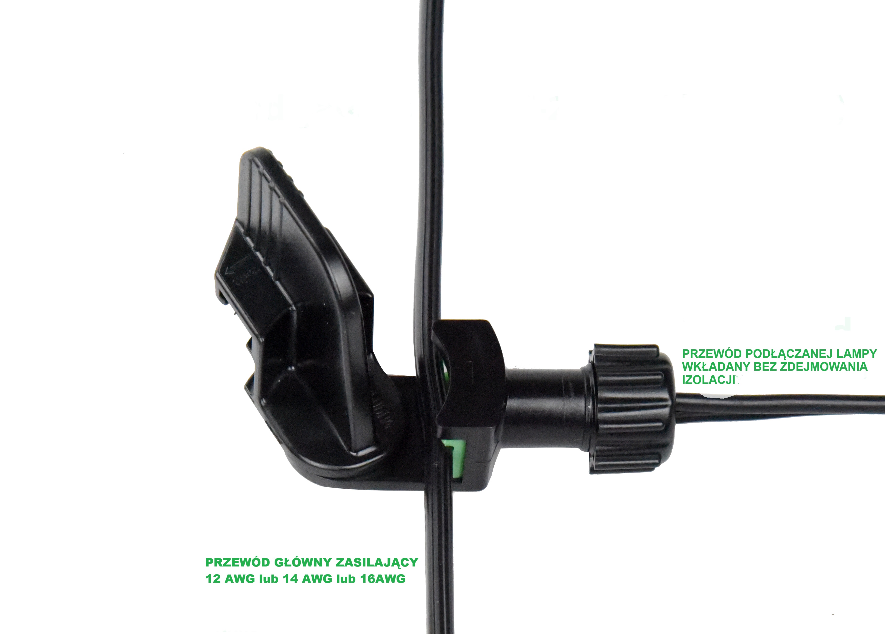 Szczelne złącze uniwersalne do wpinania w dowolnym miejscu na przewodzie 12AWG, 14AWG, 16AWG, 18AWG. Nie wymaga zdejmowania izolacji z przewodów podłączanej lampy. Szczelność IP67.
